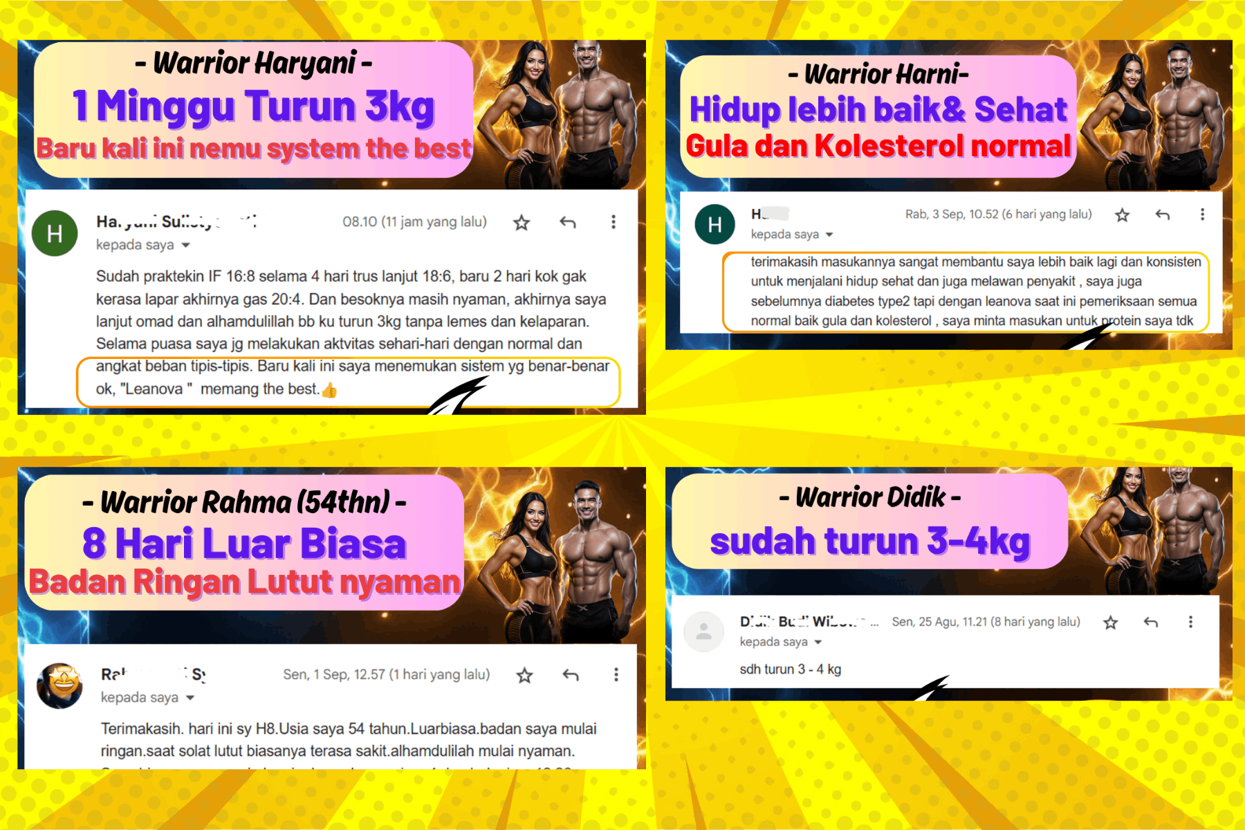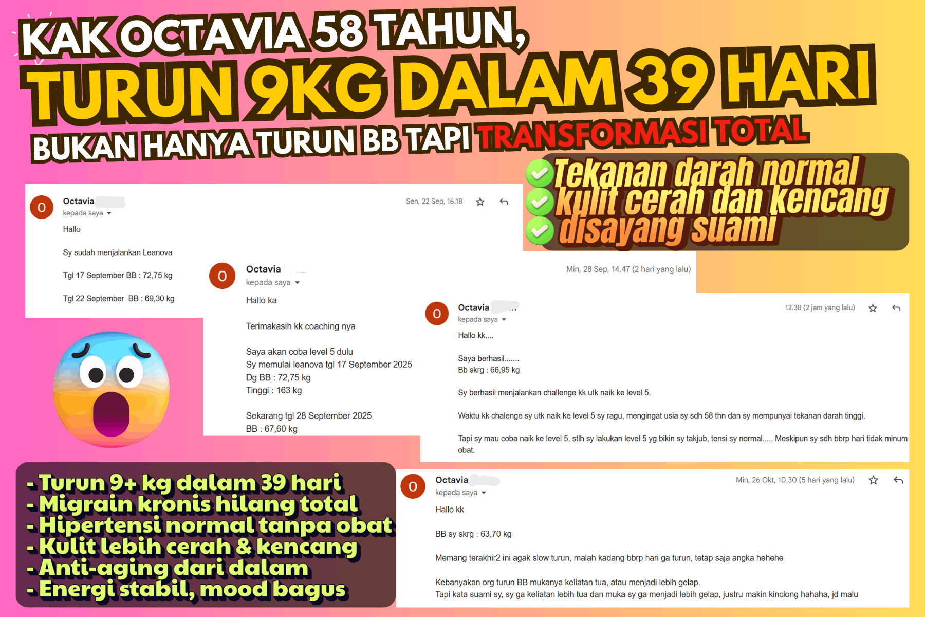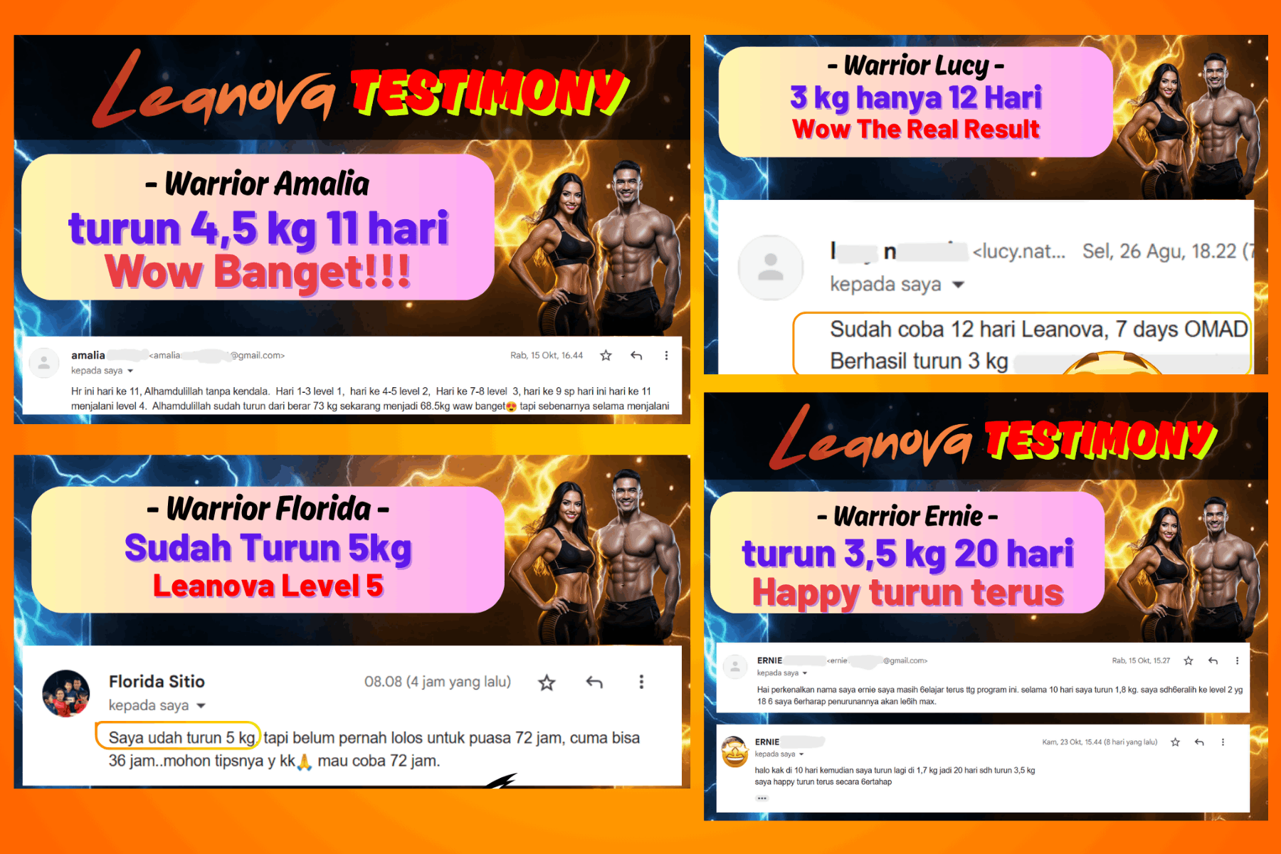 Umur 43 thn, kerja kantoran baru beberapa hari jalanin leanova, bukan hanya turun BB 4 kg dalam 6 hari aja, tapi energi Stabil, ga gampang ngantuk dan perut nggak begah.