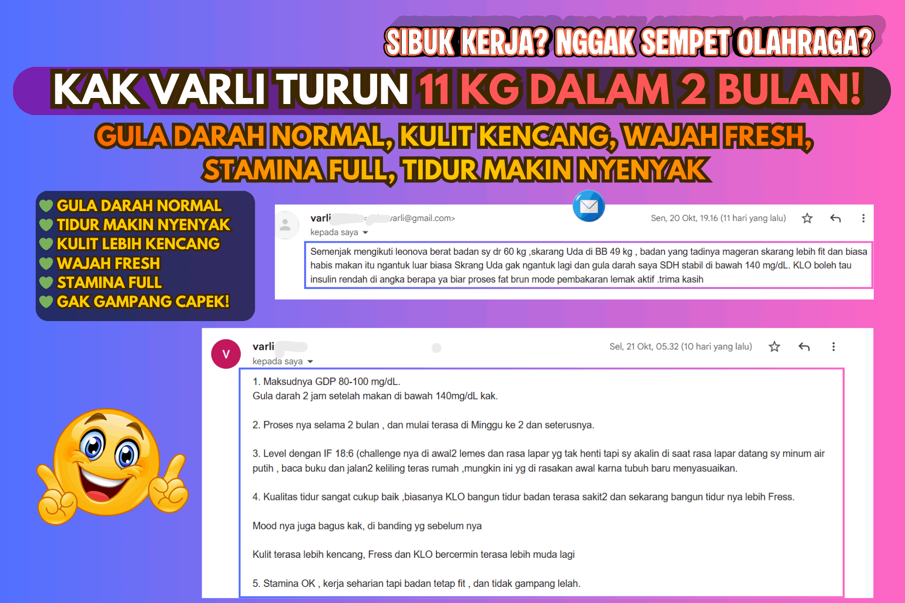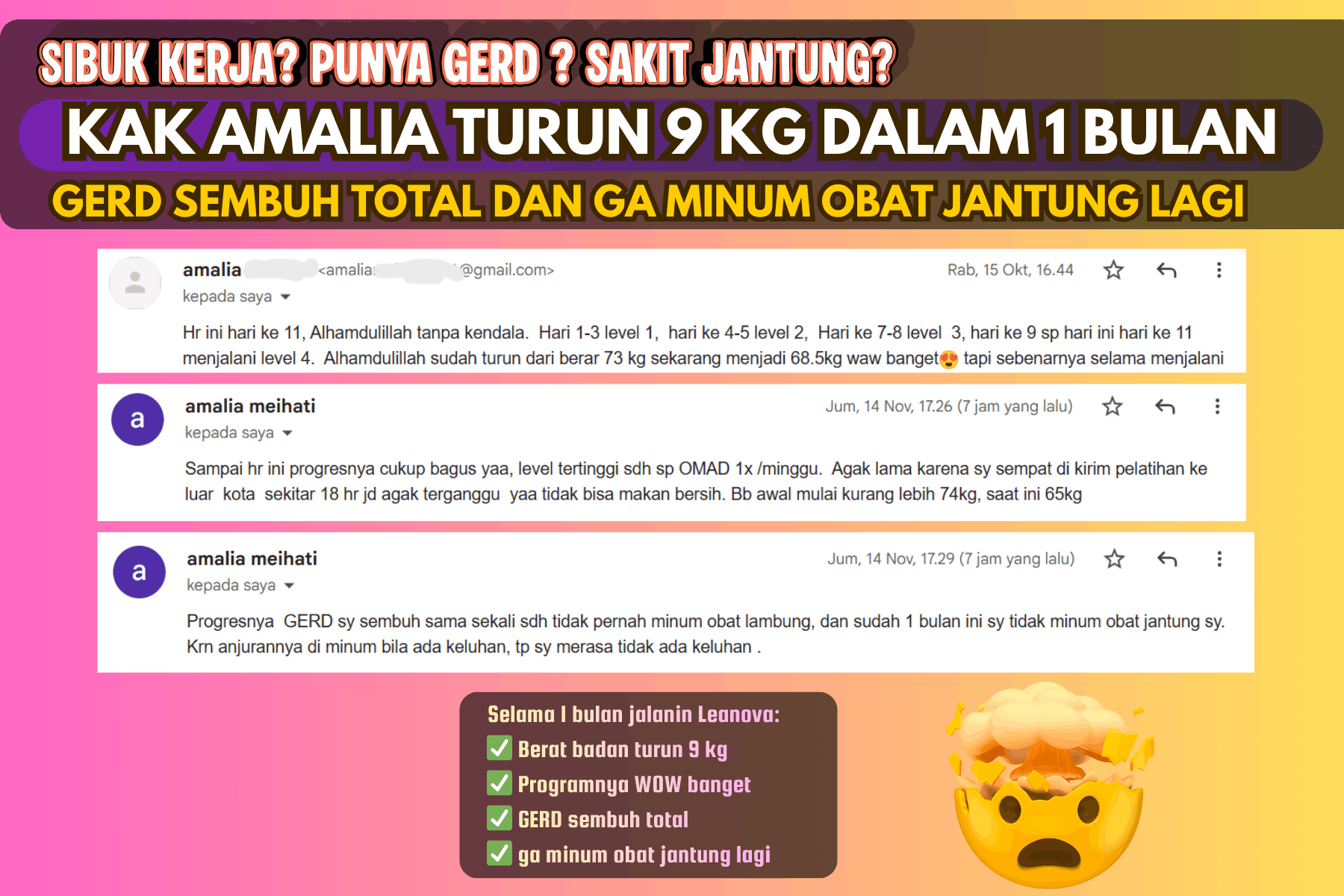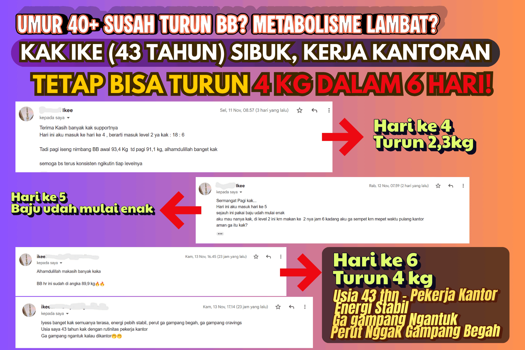 Umur 43 thn, kerja kantoran baru beberapa hari jalanin leanova, bukan hanya turun BB 4 kg dalam 6 hari aja, tapi energi Stabil, ga gampang ngantuk dan perut nggak begah.